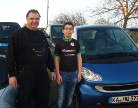 Unser erstes Patentreffen hatten wir, Patenkind Samuel Schieber, Herr Jäger und ich, in Ilsfeld mit Herrn Fischer von der Firma Fismatec. Herr Fischer wohnt seit zehn Jahren in Ilsfeld und unterstützt seit fünf bis sechs Jahren FISA da FISA ein örtlicher Verein ist der viele Jugendliche an der frischen Luft beschäftigt und er denkt, dass das Geld bei FISA gut aufgehoben sei. Auf die Frage was Samuel mit dem Geld machen wolle antwortete Samuel, dass es in die Gesamte Jugendgruppe fließt um die Fahrräder instand zu halten und zum Beispiel auch Startgelder für Wettkämpfe zu bezahlen. Fismatec ist eine Smart Reparatur und Tuning Werkstatt die am Ortseingang Ilsfeld bei der Tankstelle liegt. Samuel interessierte, warum Herr Fischer sich auf Smarts spezialisiert hat. Darauf antwortete Herr Fischer, dass es ein Zufall gewesen sei. Er gründete 2001 seine Werkstatt, in der er noch alle Fahrzeuge reparierte. Nach kurzer Zeit bekam er seinen ersten Smart, den er reparieren sollte. Er hatte Probleme Ersatzteile zu organisieren, da Smart erst seit wenigen Jahren auf dem Markt war. Da er dem Kunden versprochen hat, diesen Smart zu reparieren, musste er Ersatzteile anfertigen lassen, die gleich in einer höheren Qualität produziert wurden. Er erkannte in Smart-Reparaturen eine Chance für seine Zukunft. Heute gehört Herr Fischer zu den besten Smartexperten Weltweit und repariert Smarts aus ganz Europa. Sein Motto ist bis heute: „Das was man macht, muss man richtig machen.“ Samuel stimmte ihm voll zu und versprach mit diesem Motto in seine Wettkämpfe zu starten.