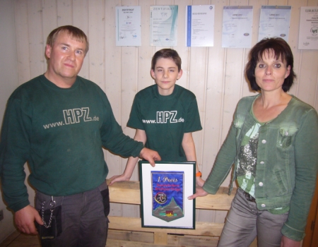 Unser zweites Patentreffen hatten wir, Patenkind Bastian Lang, Herrn Jäger und Samuel Schieber, der stellvertretende Reporter, wieder in Ilsfeld. Diesmal ging es zum HaagPalettenZenrum, HPZ, wo wir freundlich von Frau Haag empfangen wurden. Bastian stellte sich vor. Inzwischen stieß Herr Haag dazu und führte uns in sein Büro. Dort konnten wir Möbel, die aus Paletten gefertigt wurden, bestaunen. Bastian wollte jetzt unbedingt mehr über Paletten erfahren. Herr Haag erzählte uns ausführlichst die 25-Jährige Firmengeschichte von HPZ. In der Zeit, in der Herr Haag eine Meisterschule besuchte, fertigte er in seiner Freizeit Paletten für ein Unternehmen. Daraus entstand die heutige Firma HPZ. Auch in diesem Gespräch konnten wir sein Motto erfahren, was seiner Meinung nach noch bis heute gültig ist: „Man muss immer ein Ziel haben.“ Frau Haag, die selber gerne Rad fährt, wollte noch von dem Patenkind Bastian Lang wissen, welche Disziplin ihm im Triathlon am besten gefalle. Nachdem Bastian etwas überlegt hatte, antwortete er, dass ihm alle Disziplinen Spaß machen. Zum Abschluss bekamen alle drei einen Modell LKW von HPZ. Bastian konnte sich noch über einen HPZ grünen Rucksack freuen. |