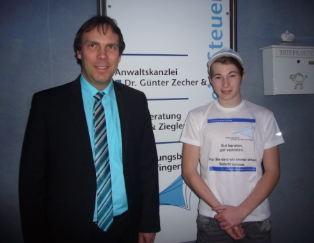 Am Donnerstag den 12. Februar hatten wir das Patentreffen mit Patenkind Daniel Willig, und Pate Michael Zecher. Als wir in der Anwaltskanzlei Zecher mit etwas Verspätung angekommen waren, wurden wir zugleich von einer netten Dame empfangen. Wenige Augenblicke später kam Herr Zecher zu uns und führte uns in sein Büro. Er ergriff schnell die Initiative, indem er uns Fragen über FISA und die Vielfalt ihrer sportlichen Aktivitäten stellte. Samuel Schieber, der stellvertretende Reporter, interessierte sich für die Geschichte, wie Herr Zecher zum Beruf Rechtsanwalt kam. Herr Zecher erzählte, dass es nahe lag, da sein Vater die Anwaltskanzlei gründete. Patenkind Daniel Willig wollte wissen, was für ein Schnitt man braucht, um Jura zu studieren und Rechtsanwalt zu werden. Herr Zecher meinte man müsse schon gut sein, jedoch auch nicht so extrem gut. Weiter erzählte er über sein Engagement als Vorstand im Gewerbeverein Ilsfeld. Auf die Frage, was man da so mache, antwortete er, der Verein würde zum Beispiel die verkaufsoffenen Sonntage organisieren. Nachdem Herr Zecher uns noch viel Glück für unsere kommenden Wettkämpfe wünschte, machten wir noch ein nettes Foto und verabschiedeten und dann. |
