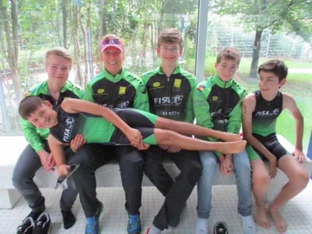 Noah: Morgens auf der Hinfahrt war ich schon noch richtig nervös. Dort angekommen und den FISA Triathlon Einteiler angezogen lies die Nervosität dann nach und ich war bereit.